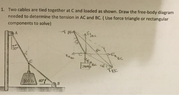 Two Cables Are Tied Together At C And Loaded As Shown In The Figure Below Draw The Free Body Diagram Needed To Determine The Tension In Ac And Bc Use Force Triangle Or
