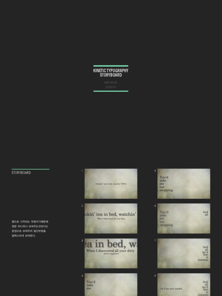 This kinetic typography video was created in attempt to capture the emotion and sensations felt from the song itself and translating that visually through kinetic typography as well as photography and videography. This week I got into the nitty-gritty of really bringing my storyboard to life with transition animations. A blue bed in the middle.